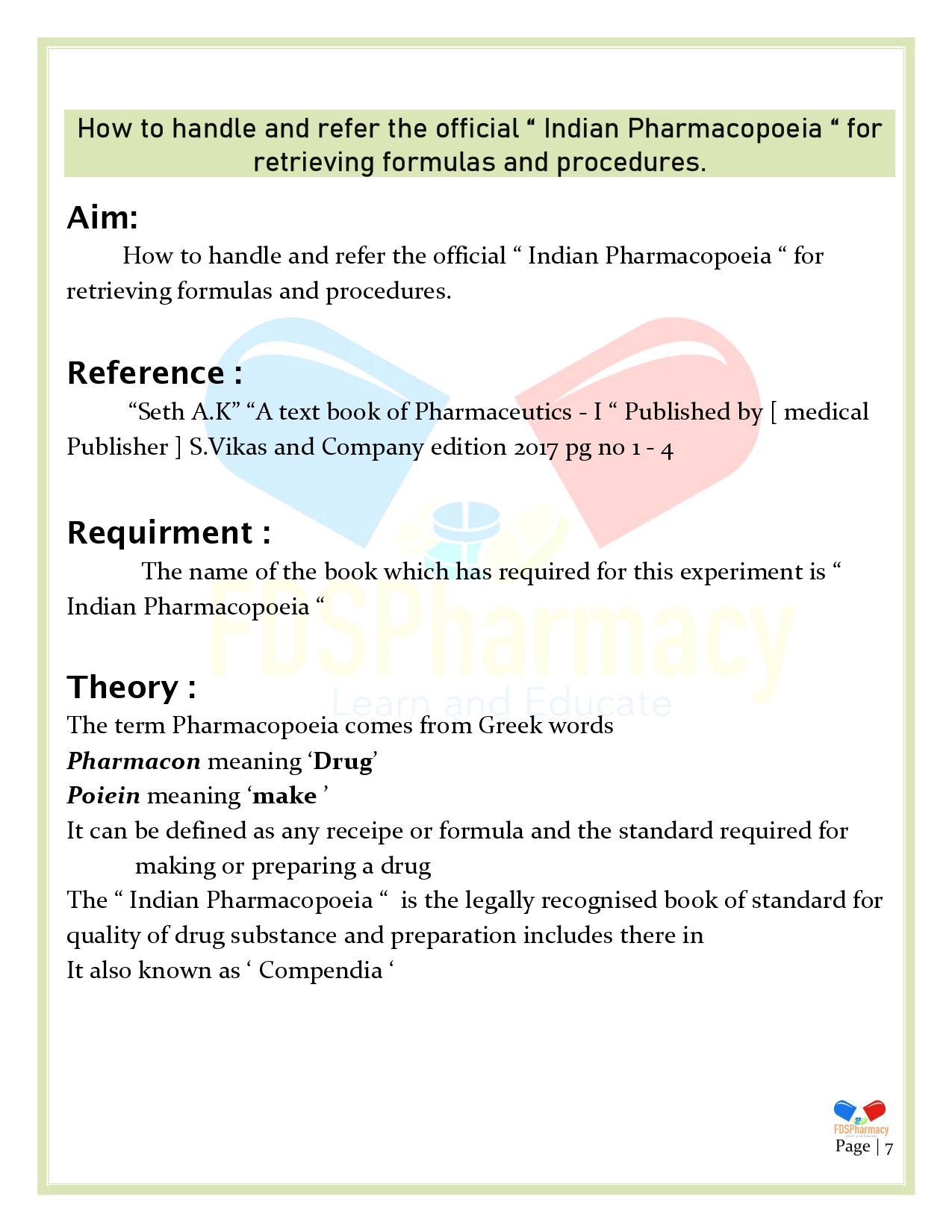 Practical 1 : How to handle and refer the official “ Indian Pharmacopoeia “ for retrieving formulas and procedures