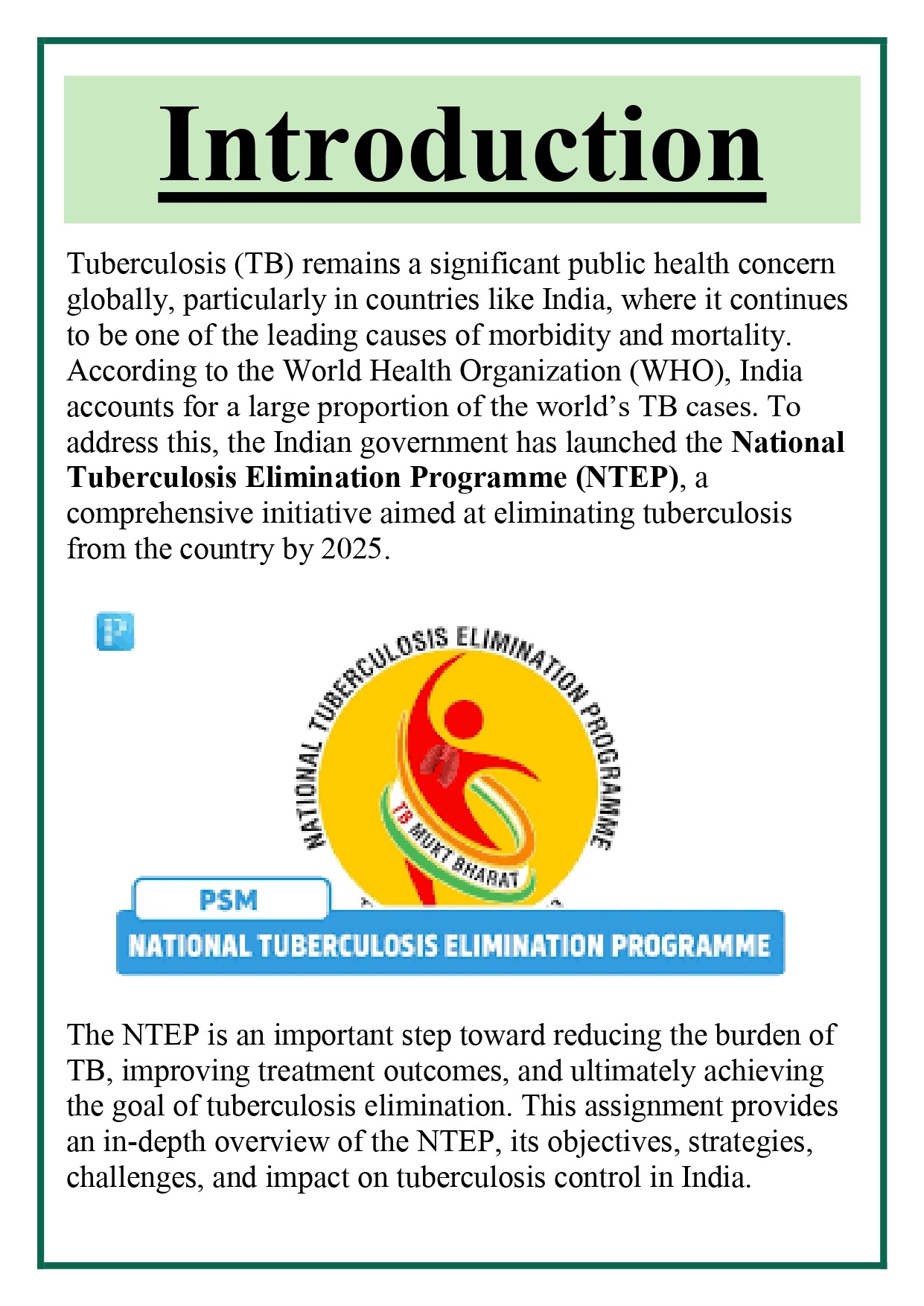 Overview on the National Tuberculosis Elimination Programme (NTEP) Assignment